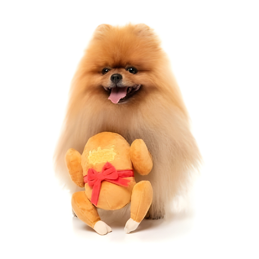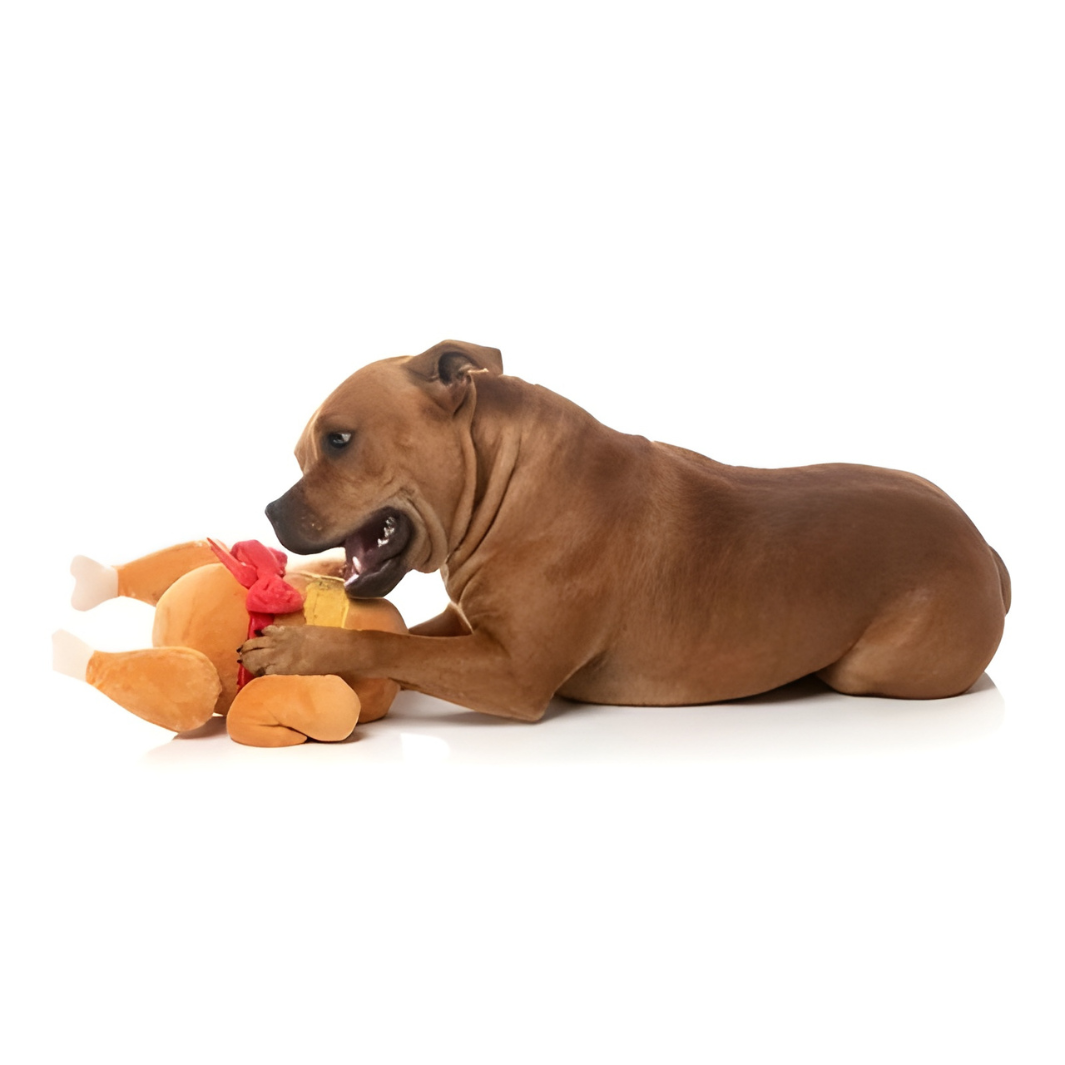 Dieses festliche Hundespielzeug in Form eines gebratenen Truthahns mit roter Schleife ist ideal zum Spielen und Kuscheln. Aus weichem Plüsch gefertigt und mit verspielten Details versehen, sorgt dieser Mini-Braten für jede Menge Spielspaß während der Feiertage.