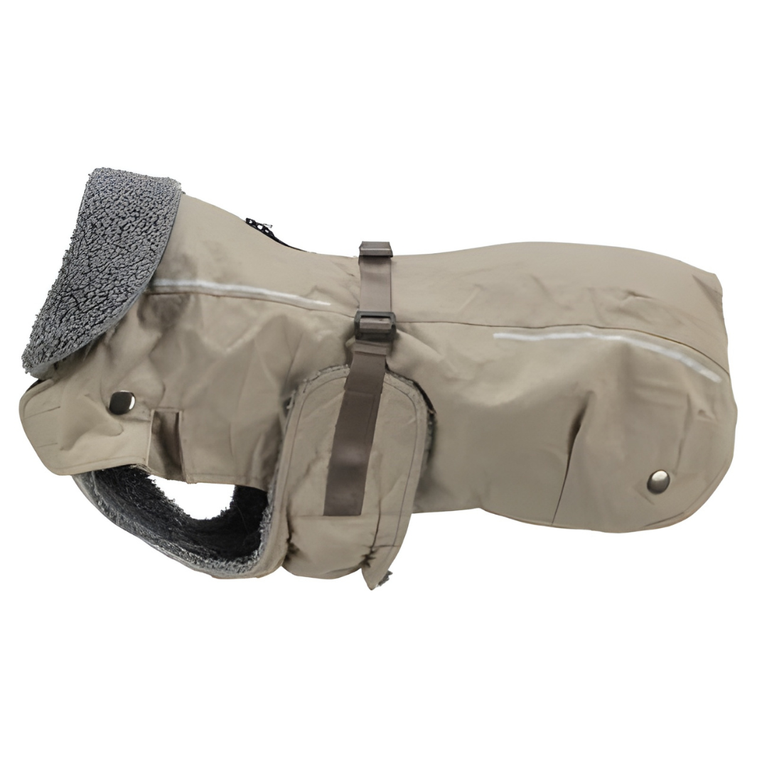 Er ist aus hochwertigem Polyester gefertigt und bietet optimalen Schutz und Komfort. Das herausnehmbare Plüschfutter sorgt dafür, dass dein Hund immer schön warm ist, und die reflektierenden Elemente verbessern die Sichtbarkeit im Dunkeln. Der elastische Bauchlatz schützt vor Kälte und Schmutz, und dank des Klettverschlusses im Brustbereich lässt sich der Mantel leicht an- und ausziehen. Der Bauchgurt ist mit einer Schnalle versehen. Die Beinschlaufen für die Hinterbeine sind verstellbar. Die Kordelzüge am Rückenteil und die weite Passform sorgen dafür, dass die er perfekt sitzt, ohne einzuengen. Außerdem ist der Mantel wasserabweisend und kann problemlos bei 30 Grad gewaschen werden.